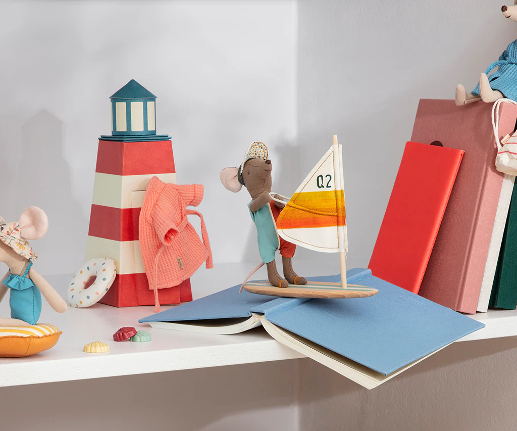 Vacation time. This mouse is ready for a day at the beach. He is dressed in a surf suit and brings his surfboard, and to complete the surfer look, he wears his sunshade cap - he is ready to ride the waves! The surfboard and mast are made of wood.